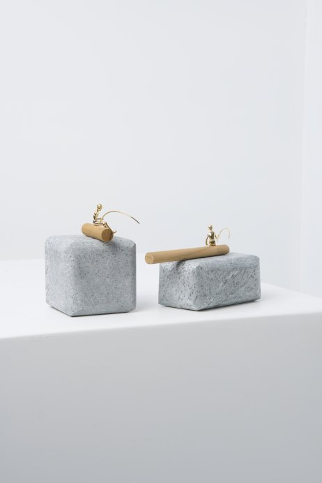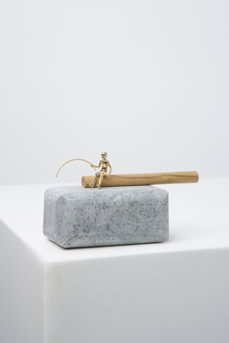 Como em um rio que corre e nunca mais é o mesmo, o pescador é o elemento natural. Base que conduz ao limite e separa o tudo do nada. Dalí, o infinito parece possível. Pedrão sabão e ferro fundido ganham vida ribeirinha.